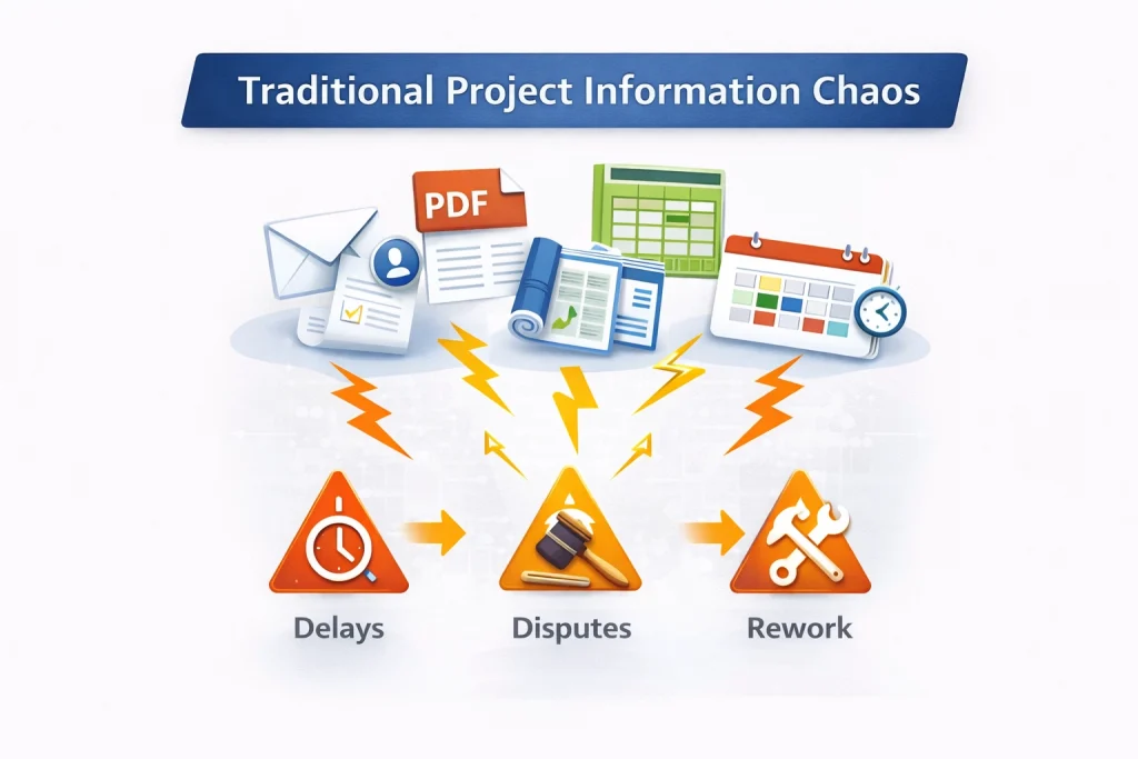 Traditional project controls often fail for one simple reason: information is fragmented – emails, PDFs, spreadsheets, siloed schedules, and disconnected site reports. That fragmentation creates:
