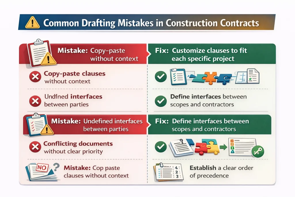 Copy-paste clauses without context. Using standard clauses from other contracts without considering if they fit.