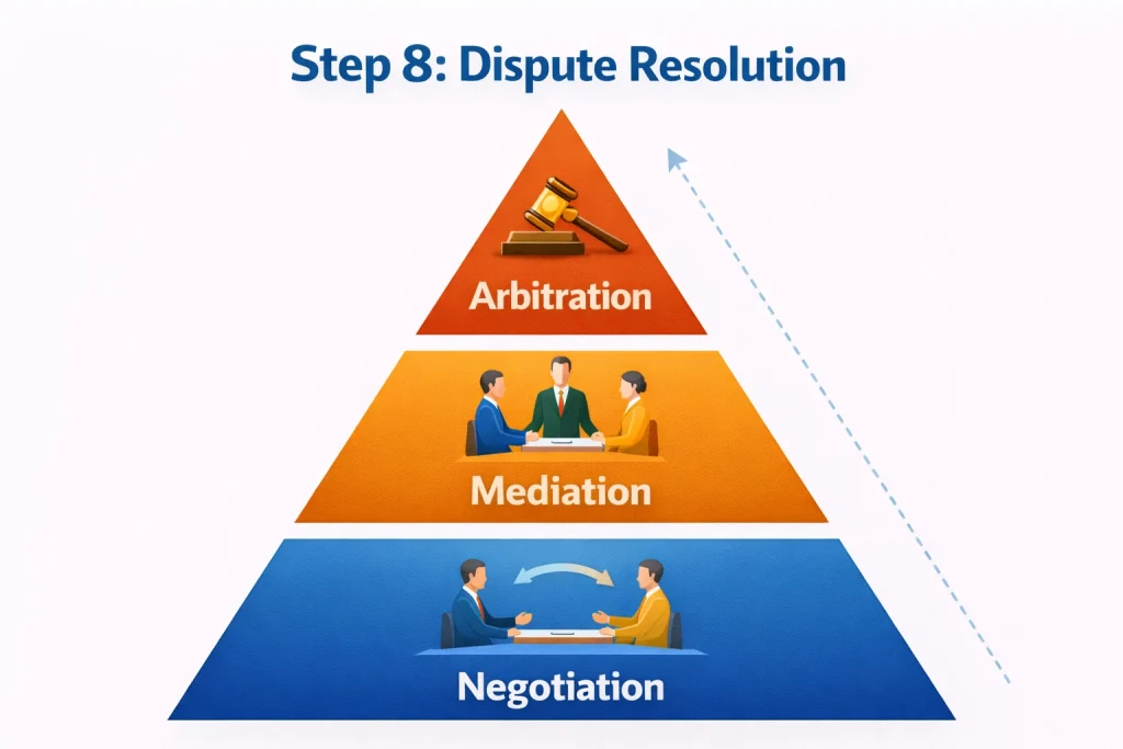 Predictable dispute resolution. When disagreements arise, there’s a clear path. Negotiation first. Escalation steps. Final binding resolution.