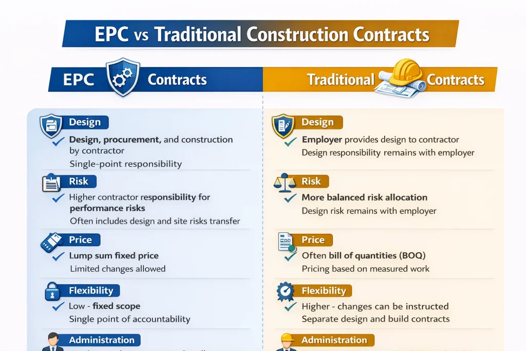 Single point responsibility. EPC means one contractor does everything. Design, procurement, construction. This must be crystal clear.