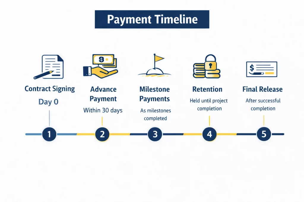 Define payment milestones clearly. Milestones must be objective and verifiable. Not “substantial progress.” Say “foundation concrete for all structures completed and cured, certified by the Engineer.”