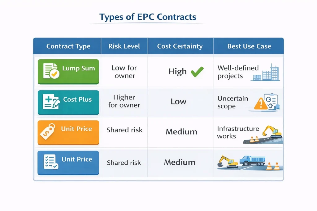 Common EPC contract types include lump sum contracts, cost plus contracts, and unit price contracts.