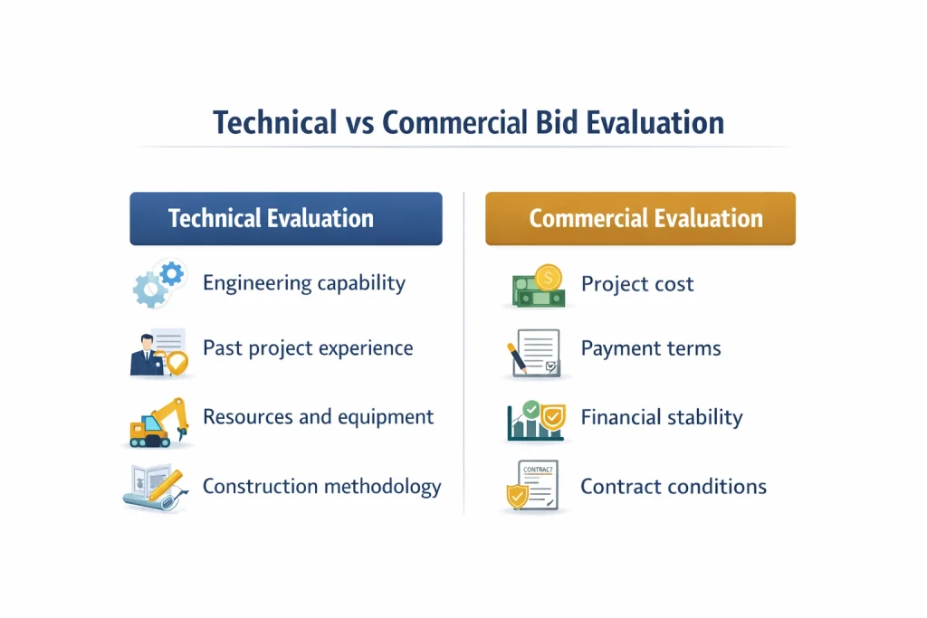 Bid evaluation is the process of analyzing contractor proposals based on technical capability, financial offer, and compliance with tender requirements.