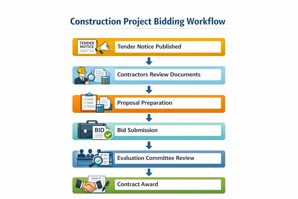 The tendering process steps define the structured workflow used to invite bids, evaluate contractors, and award project contracts.