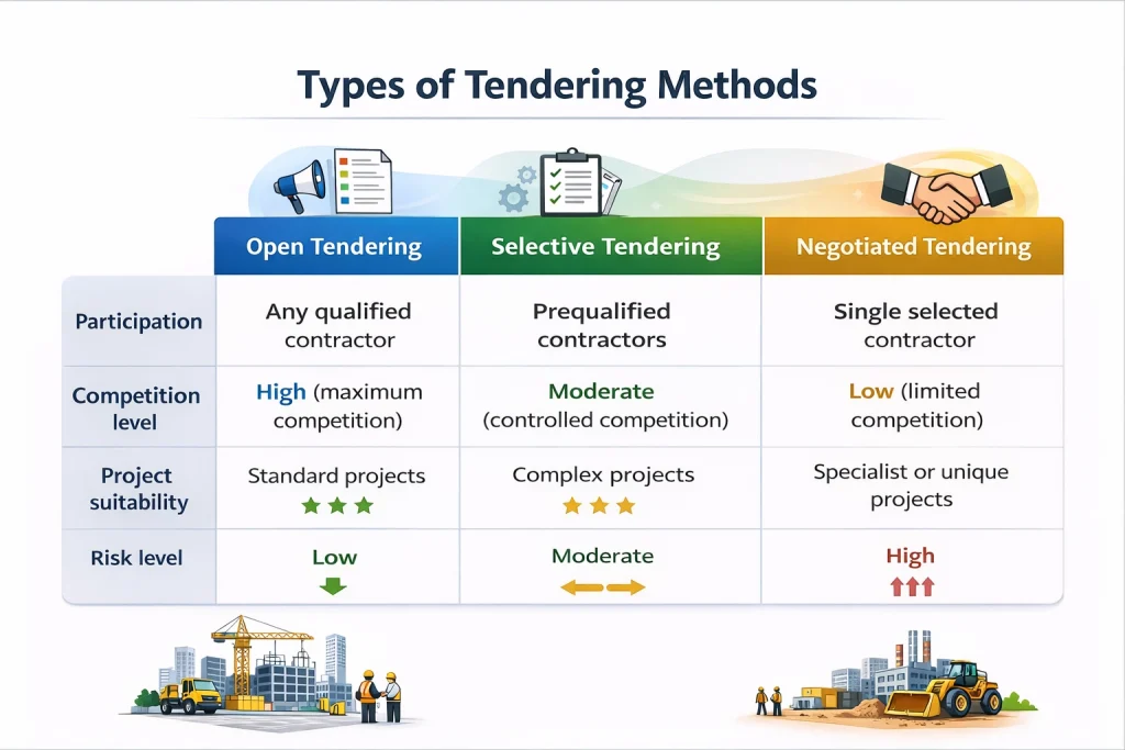 Different tendering methods are used depending on project complexity and procurement strategy.