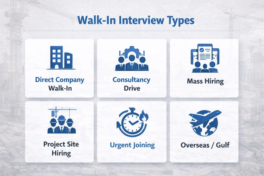 Walk-in interviews are one of the quickest ways to get a job in the construction and civil engineering industry, especially for freshers and diploma holders. Instead of long online processes, walk-ins allow you to meet the recruiter directly, submit your resume, and attend the interview on the same day. On this RKS page, you will find regularly updated information about construction walk-in interviews, civil engineering jobs near you, and city-wise openings, including Chennai, Pune, Mumbai, Bangalore, Hyderabad, Delhi NCR, and more. We cover both freshers and experienced roles such as Civil Site Engineer, Junior Engineer, Billing Engineer, QA/QC Engineer, Planning Engineer, Surveyor, and BIM Modeler. You’ll also get simple guidance on documents to carry, how to prepare, common interview questions, and how to avoid fake job posts. Bookmark this page and check back often for the latest walk-in drives.